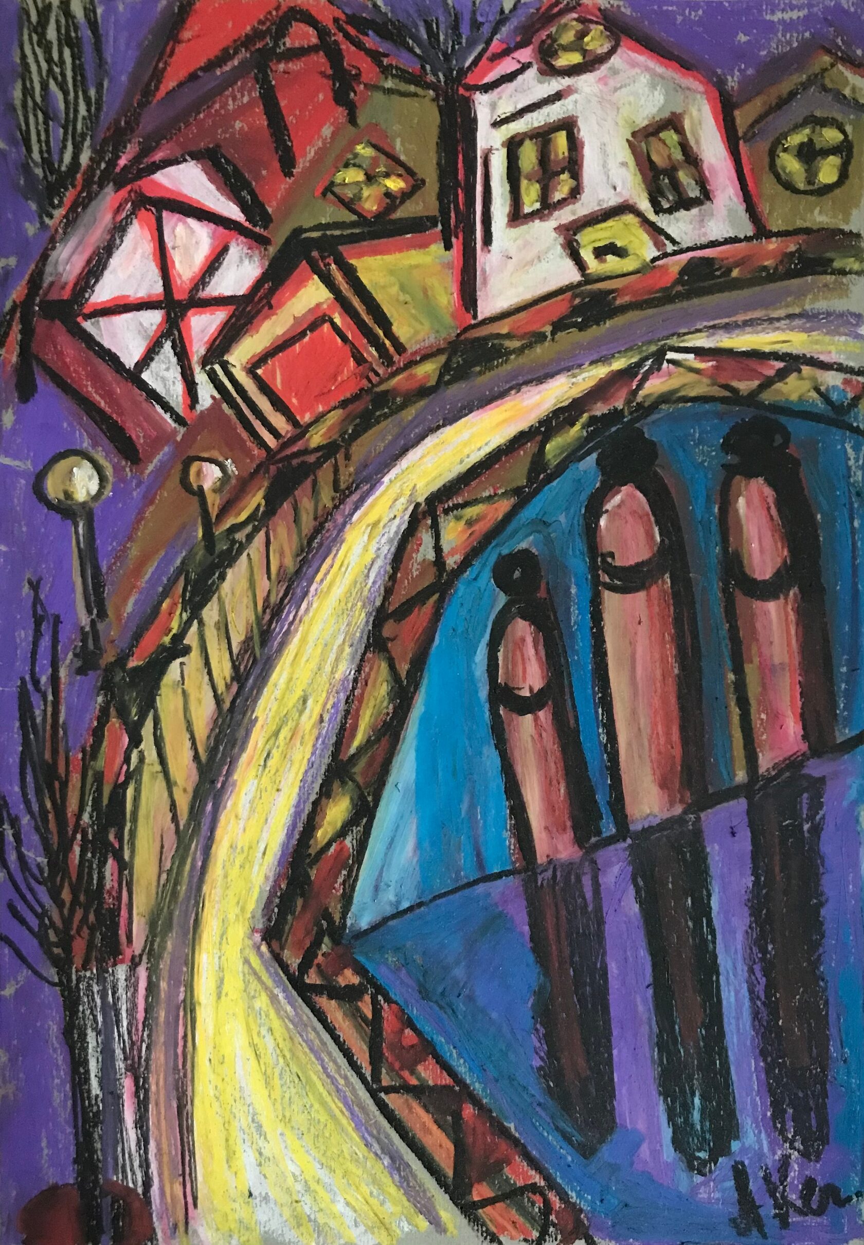 Картина современного художника Аллы Кечеджан "Городской мост", бумага, масляная пастель, 30*20, 2025