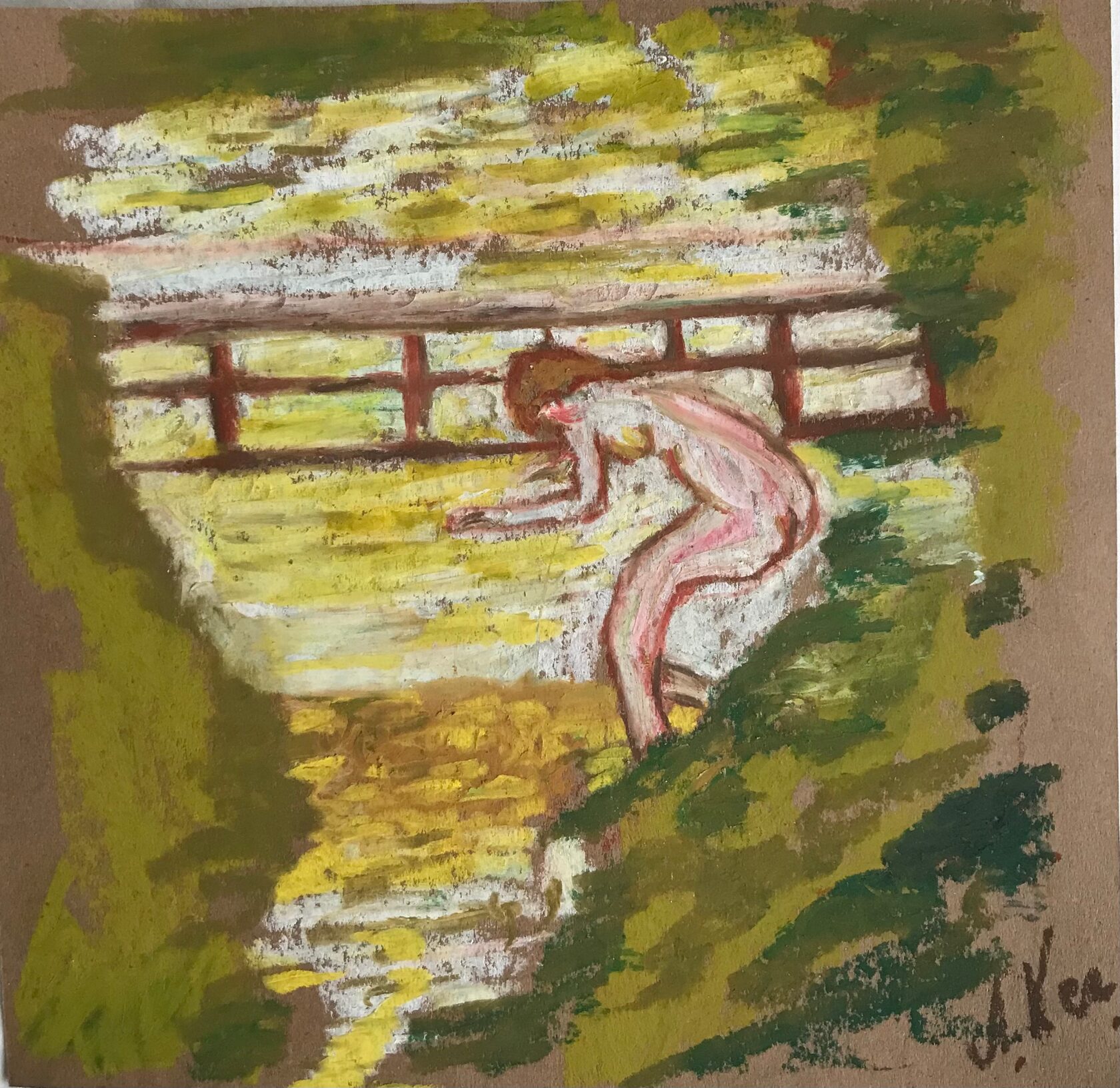 Картина современного художника Аллы Кечеджан "Купальщица"", бумага, масляная пастель, 30*20, 2025