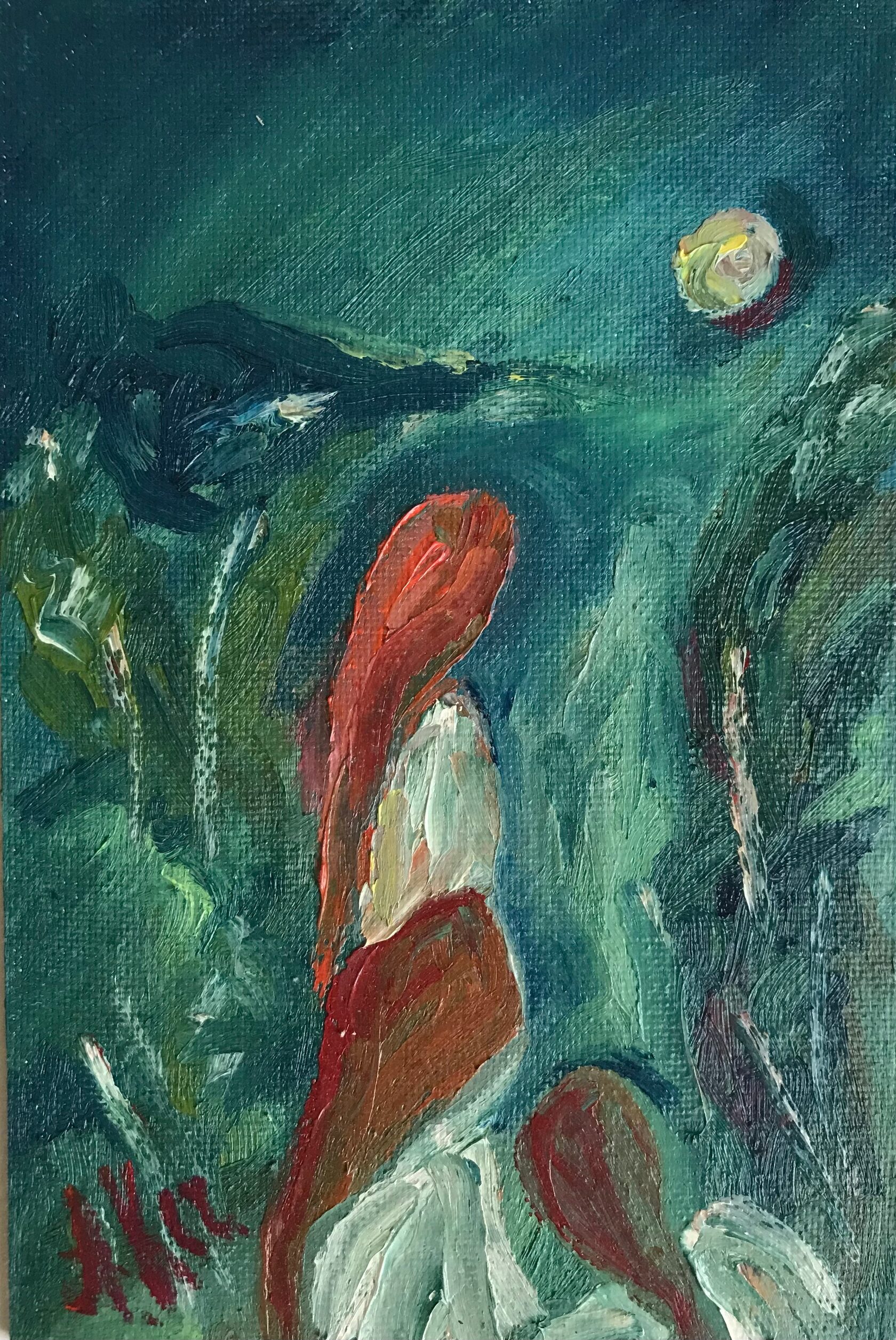 Картина современного художника Аллы Кечеджан "Стайка рыб", фибролит, масло, 30*20, 2025