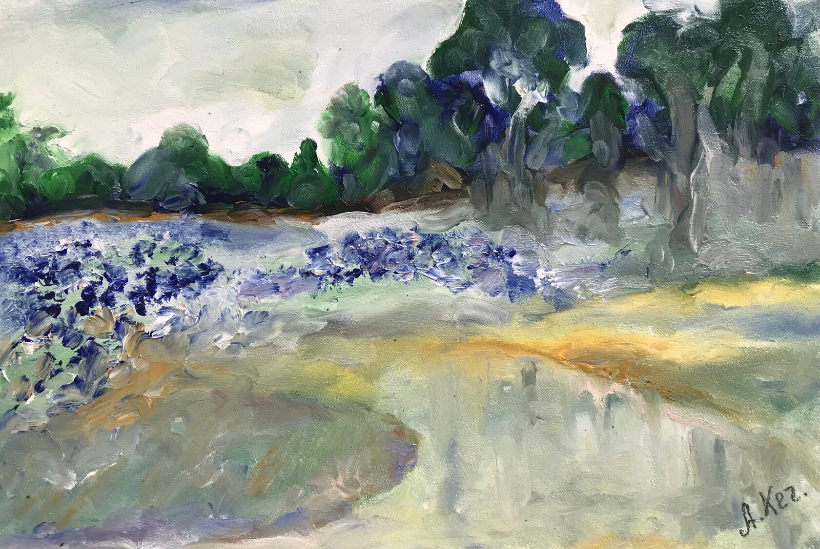 Картина современного художника Аллы Кечеджан "Цикориевые поля в тумане у реки", холст, масло, 25*35